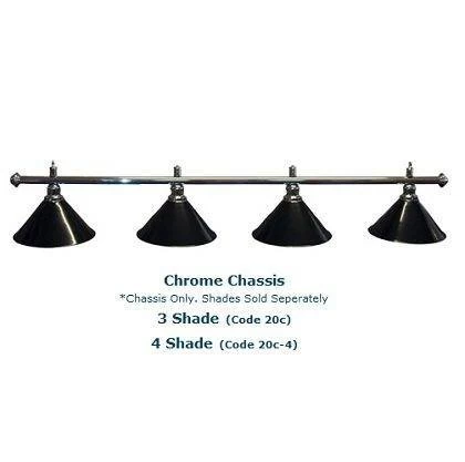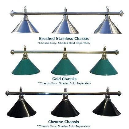 This Snooker and Pool Table Lights Chassis is available in both three and four lights systems. For 6 – 9 foot we recommend Three Shades and for 10 ft and 12 foot Snooker Tables you would require a 4 shade. The lights chassis is available in Gold, Brushed Stainless and Chrome.